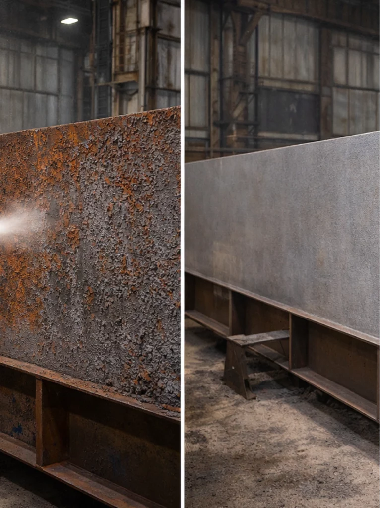 C’est la technologie de référence en industrie lourde, en maintenance d’infrastructures métalliques et en préparation avant métallisation ou peinture anticorrosion.